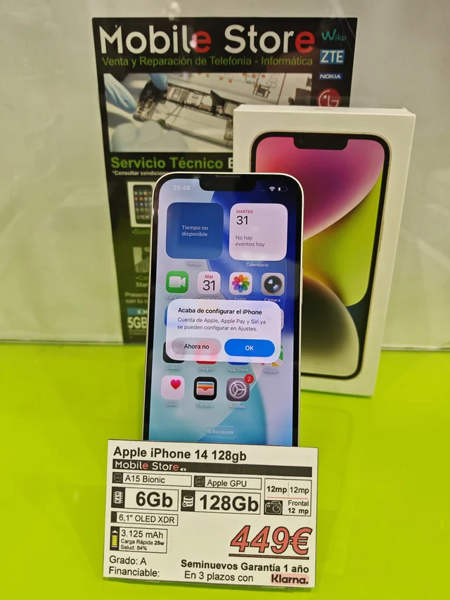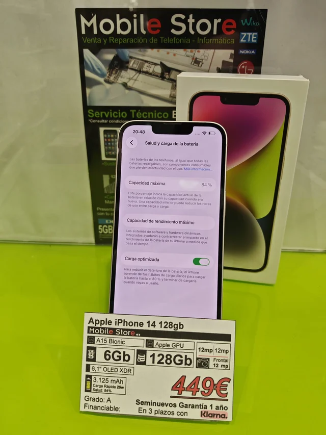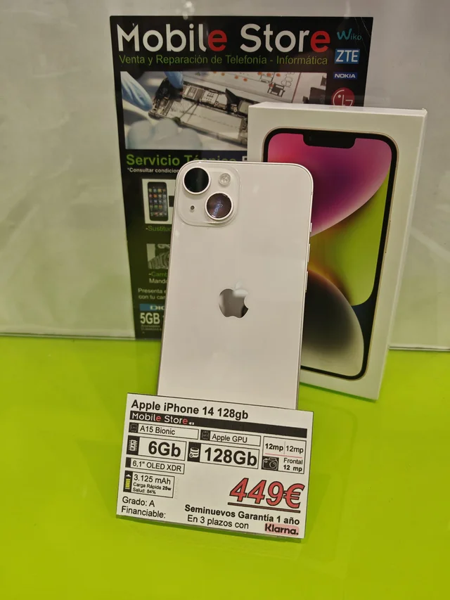 Apple iPhone 14 de 128GB en color blanco en perfecto estado. -Chip A15 Bionic -Pantalla OLED XDR de 6,1″ -Batería de 3.125 mAh, carga rápida de 25W. Salud: 84%. -Cámara frontal de 12 MP -Cámara trasera dual de 12 MP Apple iPhone 14 Pro de 128GB en excelente estado, Grado A. -Chip A16 Bionic -GPU de Apple -Pantalla OLED XDR de 6,1 -Batería 3700 mAh -Carga rápida 20W -Garantía de 1 año