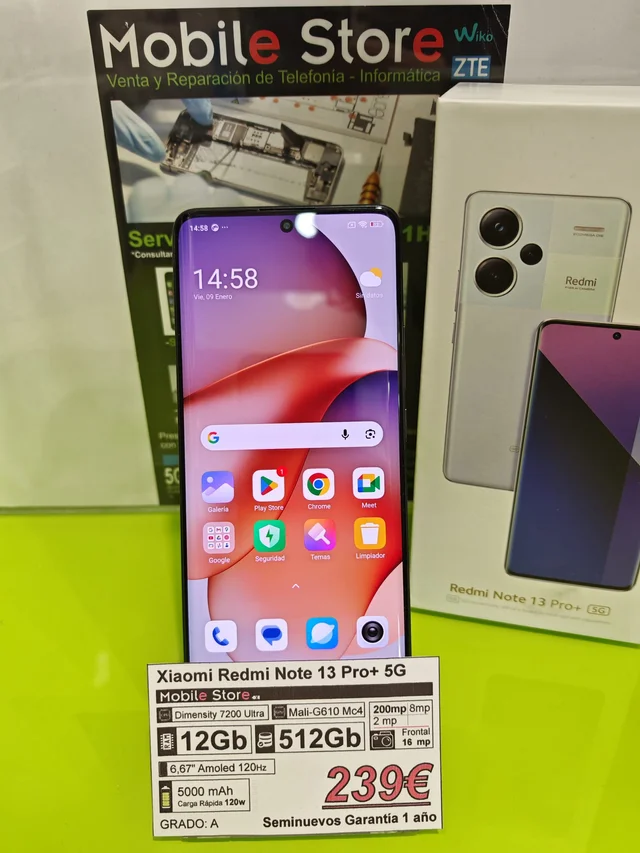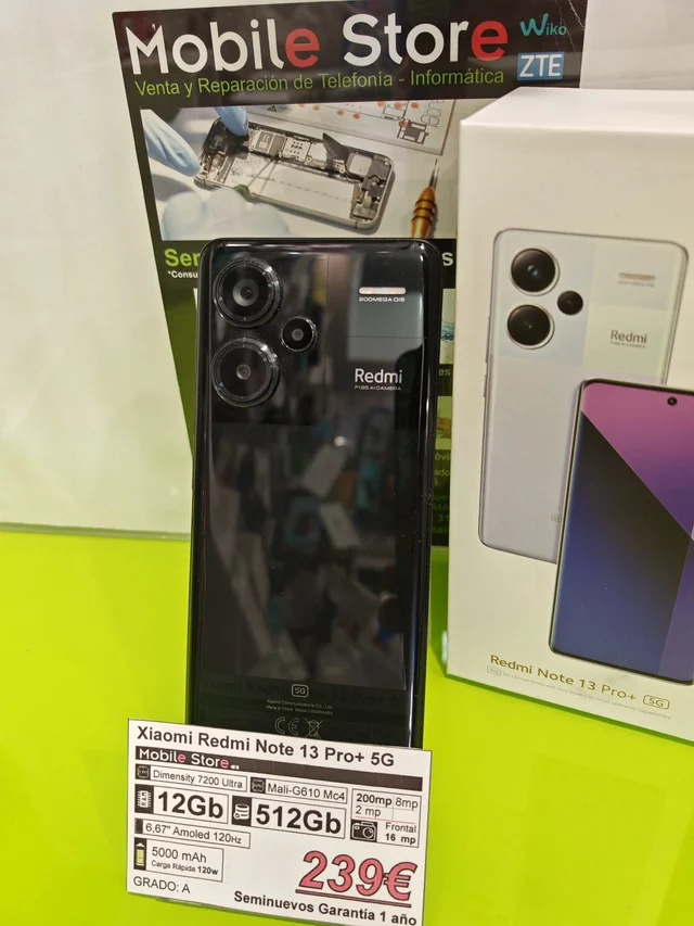 Xiaomi Redmi Note 13 Pro+ con 512GB de almacenamiento, se encuentra en perfecto estado, como nuevo. Todos nuestros artículos de segunda mano han sido testeados debidamente para comprobar su correcto funcionamiento. Damos 1 año de garantía en artículos usados y 3 años en artículos nuevos. Quieres verlos? Pásate por alguna de nuestras tiendas en Málaga: Av. de la Aurora, 19 Calle Armengual de la Mota, 10 Teléfono (Whatsapp): 627 119 234 Compramos también teléfonos, incluso con avería. Nuestras valoraciones nos avalan.